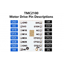 The TMC2100 provides an integrated motor driver solution for 3D-Printing, Cameras, Scanners and other automated equipment applications. The device has an integrated microstepping indexer, the completely noiseless current control mode StealthChop™ and is intended to drive a bipolar stepper motor. The output driver block consists of low RDSon N-Channel power MOSFETs configured as full H-bridges to drive the motor windings. The TMC2100 is capable of driving up to 2.5A of current from each output (with proper heatsinking). TMC2100 is designed for a supply voltage of 5~46V. The device has a step and direction interface and can be configured with digital pins.