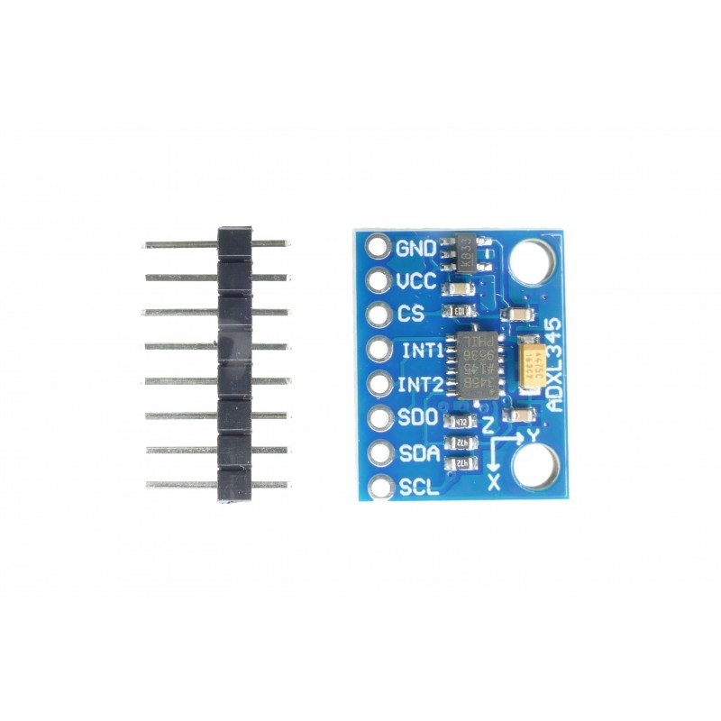 Moduł akcelerometru 3 osiowego ADXL345. Moduł mierzy przyśpieszenie w trzech osiach w zakresie ±16g. Zasilany jest napięciem od 3 do 5V. Moduł komunikuje się poprzez magistralę I²C.